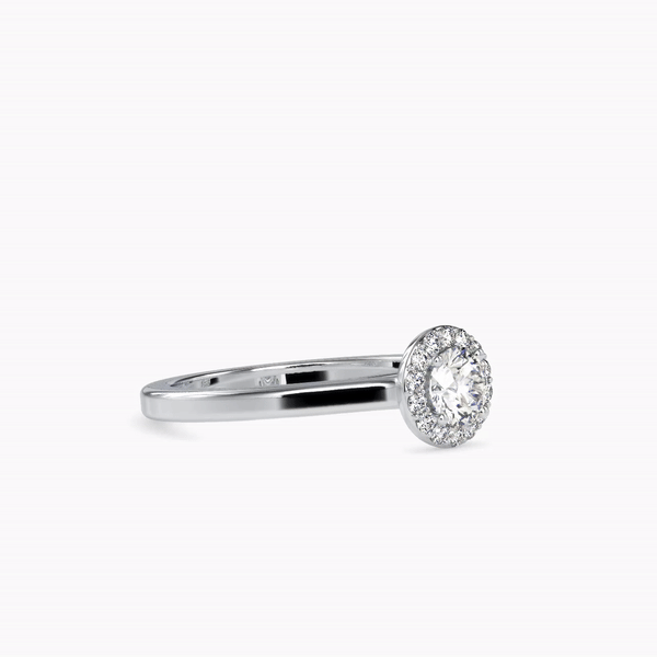 Surrounding the central diamond, a halo of smaller diamonds has been carefully crafted to enhance the principal gem's natural beauty. This halo setting amplifies the ring’s overall luminosity and adds a layer of intricate detailing, crafting an enchanting effect that captures attention from every angle. The tiny diamonds are set close together to minimize visible metal, creating a continuous circle of sparkle.