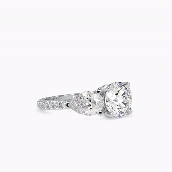 At the heart of this exquisite piece is a stunning round-shaped center diamond. This central stone is chosen for its exceptional cut and clarity, ensuring brilliance and radiance that catches every eye. Flanking the center diamond are pear-shaped side stones, carefully selected to enhance and complement the central gem. The side stones add an extra layer of grace and charm, enhancing the overall visual balance of the ring.