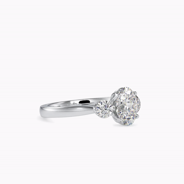 - Two Stone Round Cut Diamonds: Flanking the central oval diamond are two round-cut diamonds, adding depth and an extra touch of elegance to the overall design.