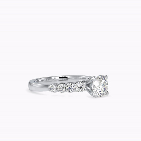 At the heart of this exquisite ring lies a dazzling round shape brilliant cut diamond, meticulously selected for its unparalleled clarity and brilliance. The centerpiece is flanked by additional stunning diamonds, creating a harmonious union of sparkle and light. Each diamond is securely encased in a prong setting, maximizing the stone's exposure to light and enhancing its natural radiance.