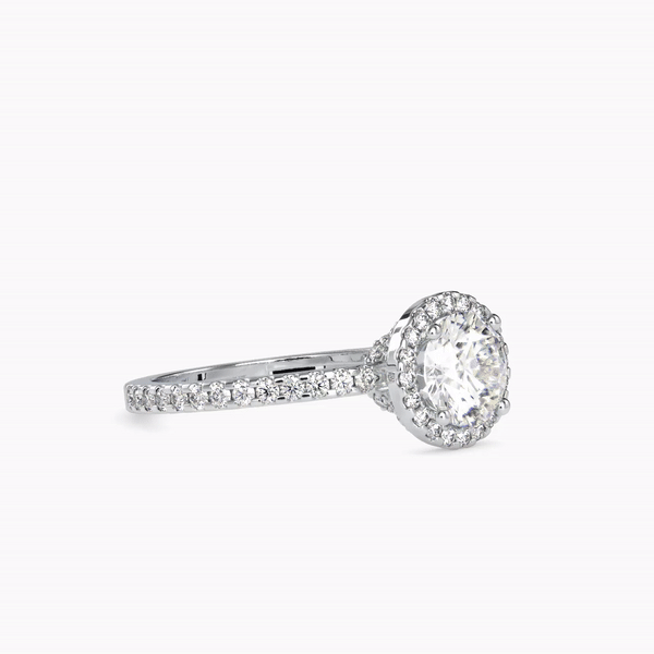 At the heart of this stunning ring is a brilliant cut diamond, masterfully shaped and polished to maximize brilliance and fire. The round-cut diamond, known for its superior sparkle and timeless appeal, serves as a dazzling centerpiece that is able to captivate any bystander. Surrounding the central gem is an intricate halo of smaller diamonds, each one cut to exacting standards, creating a radiant frame that enhances the overall brilliance and adds an extraordinary dimension of glitter and glamour.