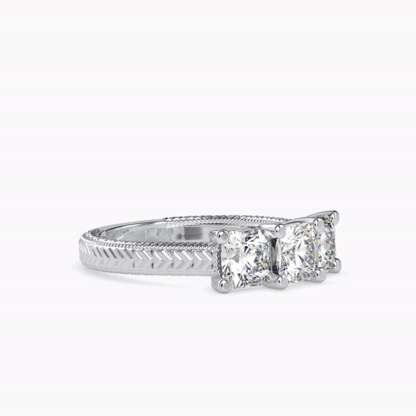 Expertly crafted, the main diamond of this exquisite ring boasts a radiant cut known for its exceptional brilliance. The radiant cut combines the best elements of the round cut and the emerald cut, presenting a dazzling fusion of brightness and fire. Flanked by two equally impressive radiant diamonds, the three-stone arrangement not only enhances the central diamond's sparkle but also adds a touch of symmetry and balance to the overall design.