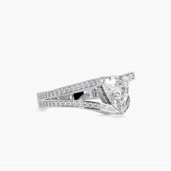 At the heart of this magnificent piece lies the trillion-shaped brilliant cut diamond, intricately shaped to ensure maximum light dispersion and brilliance. The striking design of the trillion cut, known for its triangular facets, creates a mesmerizing play of light and sparkle, ensuring that the diamond catches the eye from every angle.