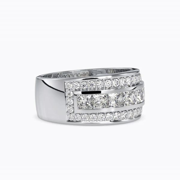 At the heart of this stunning piece lies an intricate triple row channel setting, a design that seamlessly blends modern and classic elements. This sophisticated setting is meticulously engineered to ensure each diamond is displayed to its maximum brilliance. Adorned with a mesmerizing combination of princess and round-shaped diamonds, the ring exhibits an unmatched sparkle and opulence that captivates all who behold it.