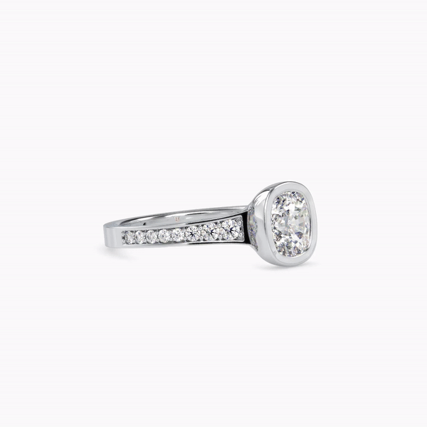 Crafted with high-quality materials, the centerpiece of this ring is a cushion-shaped diamond. The cushion cut, known for its rounded corners and larger facets, showcases an exceptional brilliance and fire. What sets this ring apart is the bezel setting, which securely encases the diamond in a metal rim, not only offering protection but also creating a sleek and contemporary look. The bezel setting accentuates the diamond's shape, adding a layer of elegance and refinement.